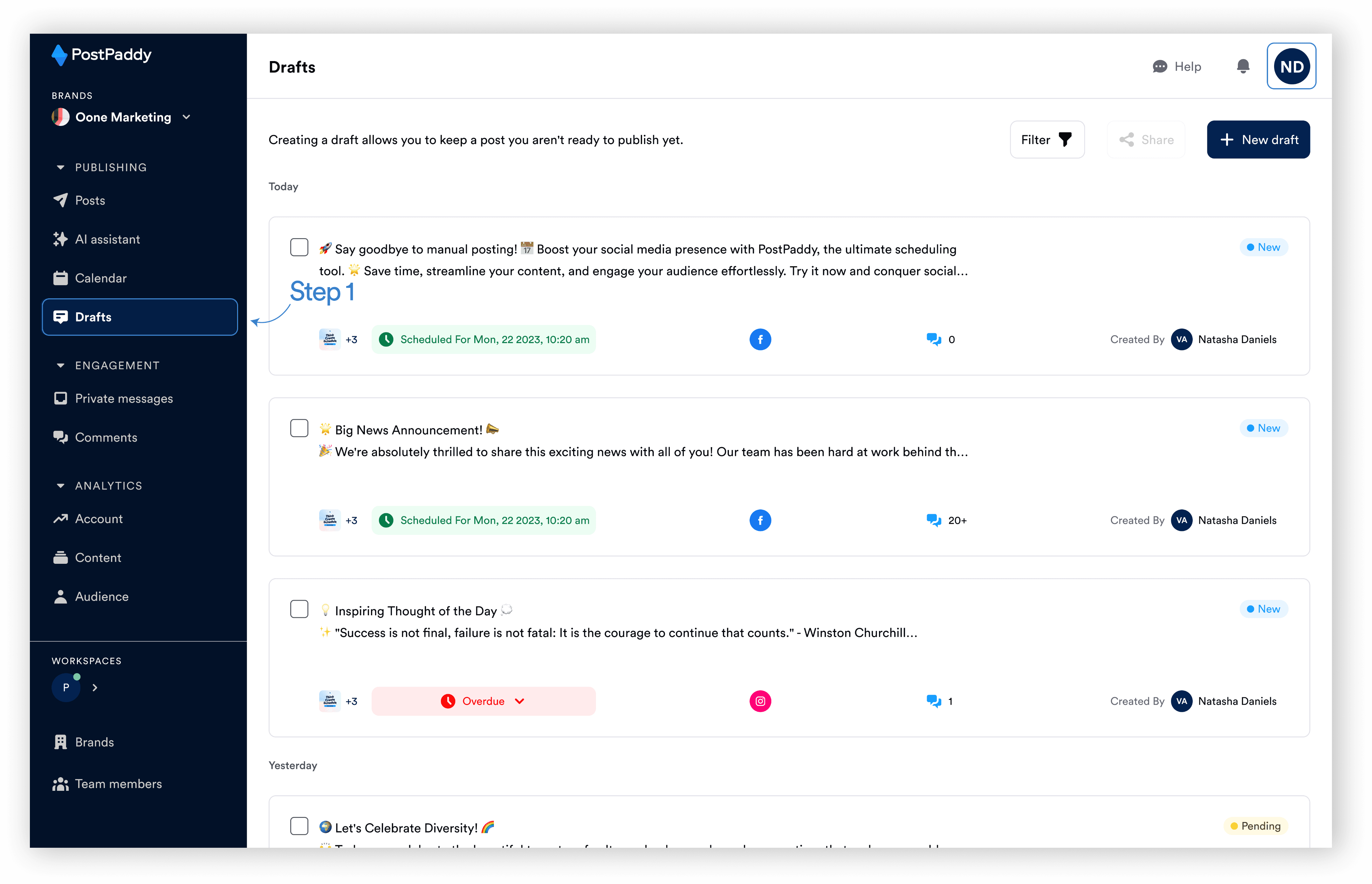 Step 1: On your PostPaddy dashboard, click “drafts” on the side navigation.