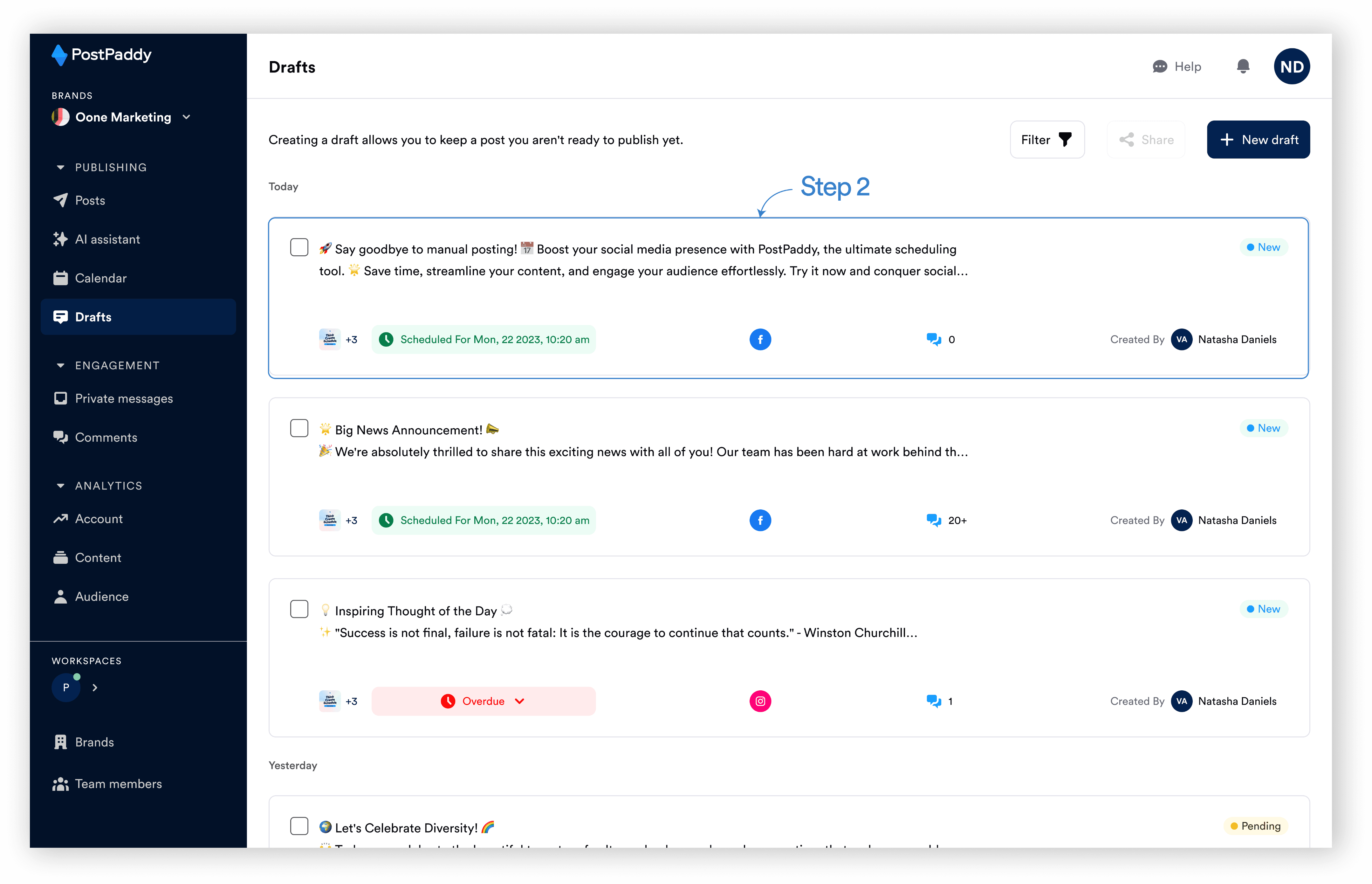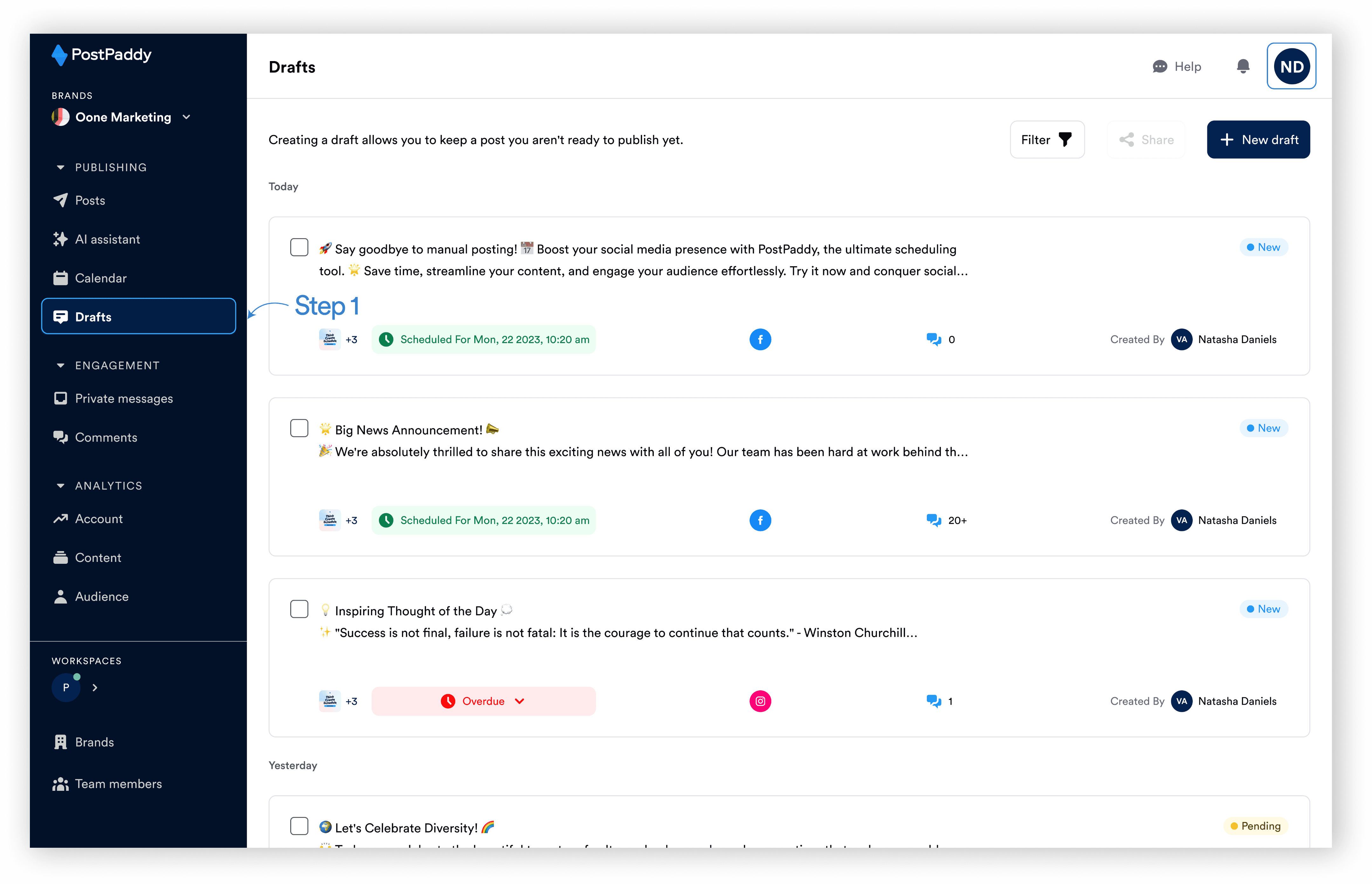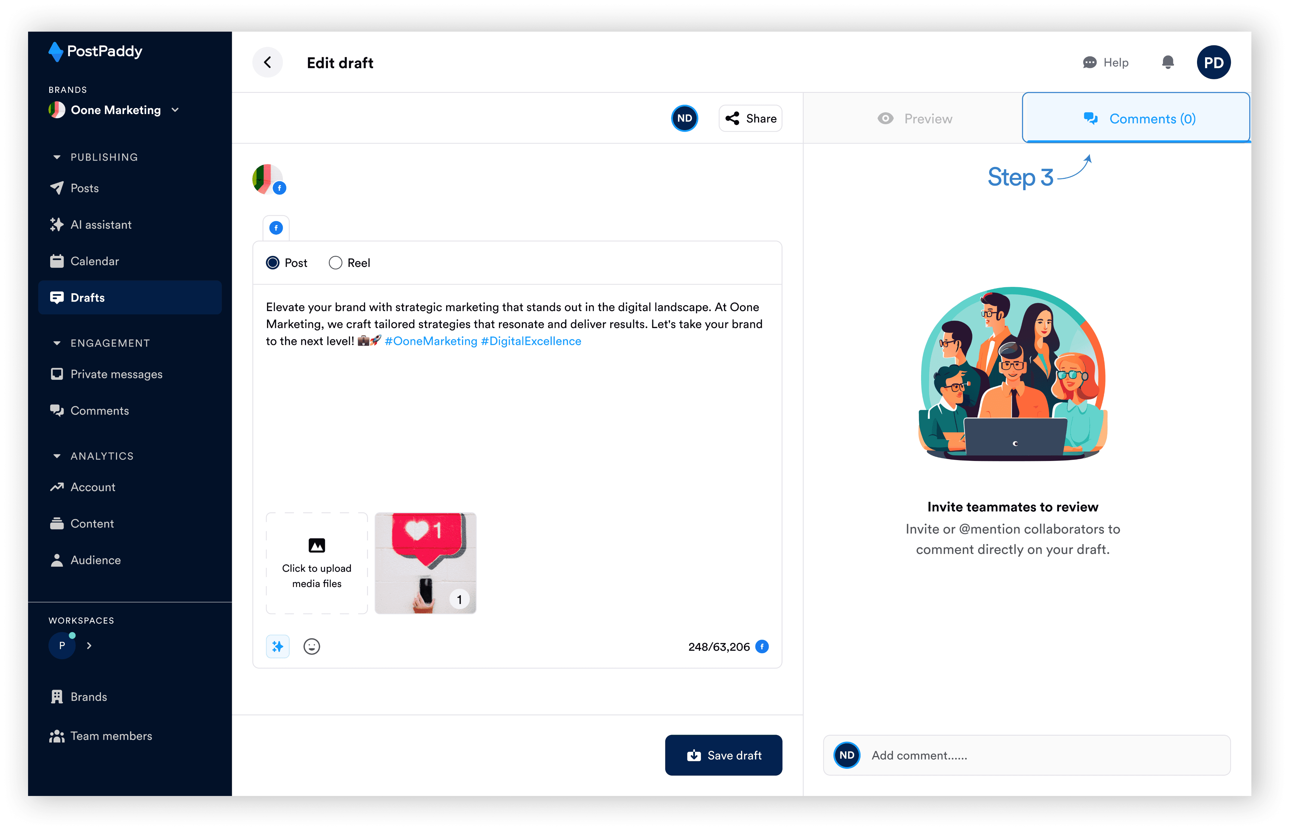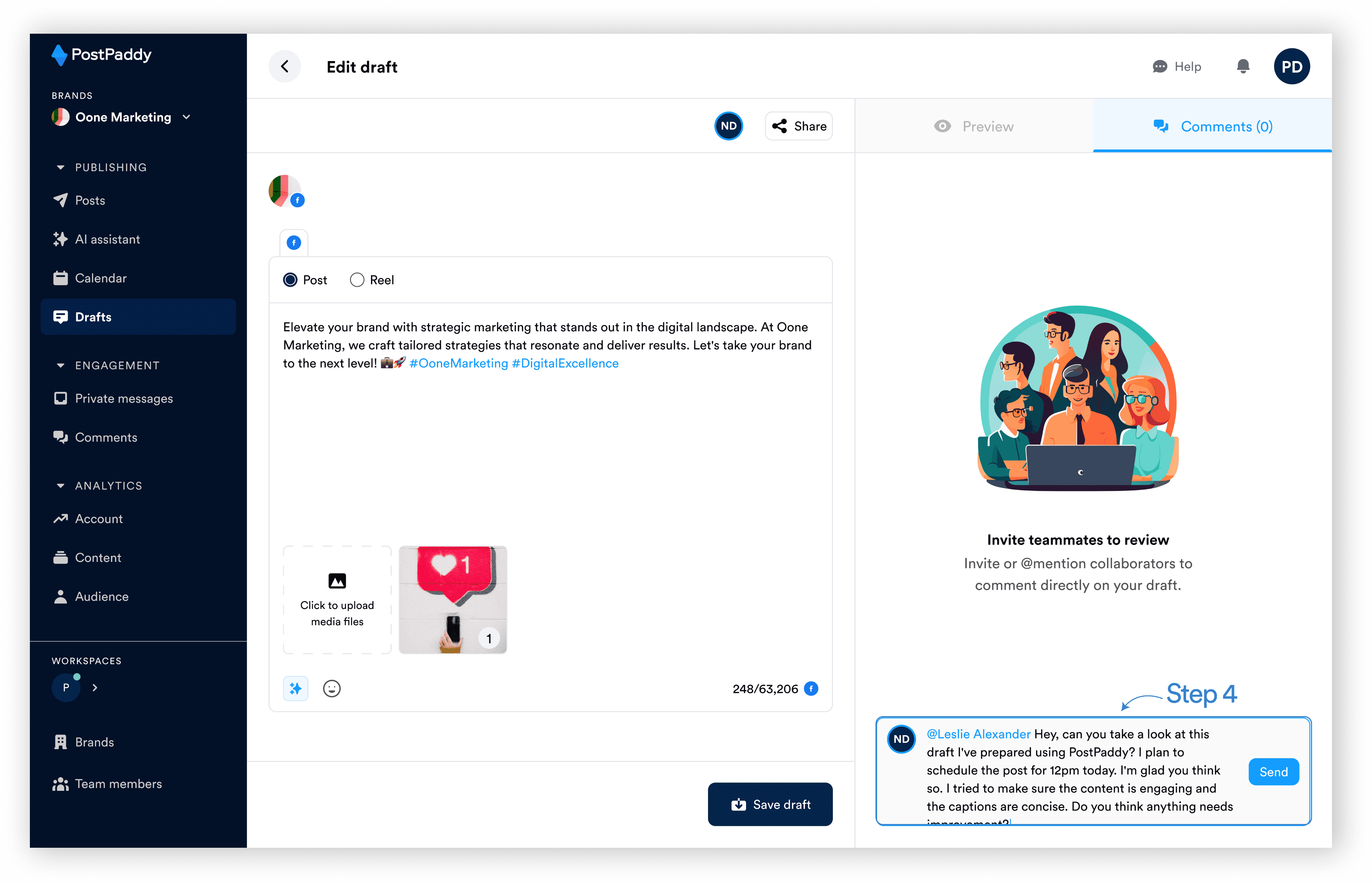 What’s teamwork without some constructive feedback? Enhance collaboration by discussing ideas and suggesting improvements on drafts shared among team members. Follow these steps to learn how to comment on drafts within PostPaddy.