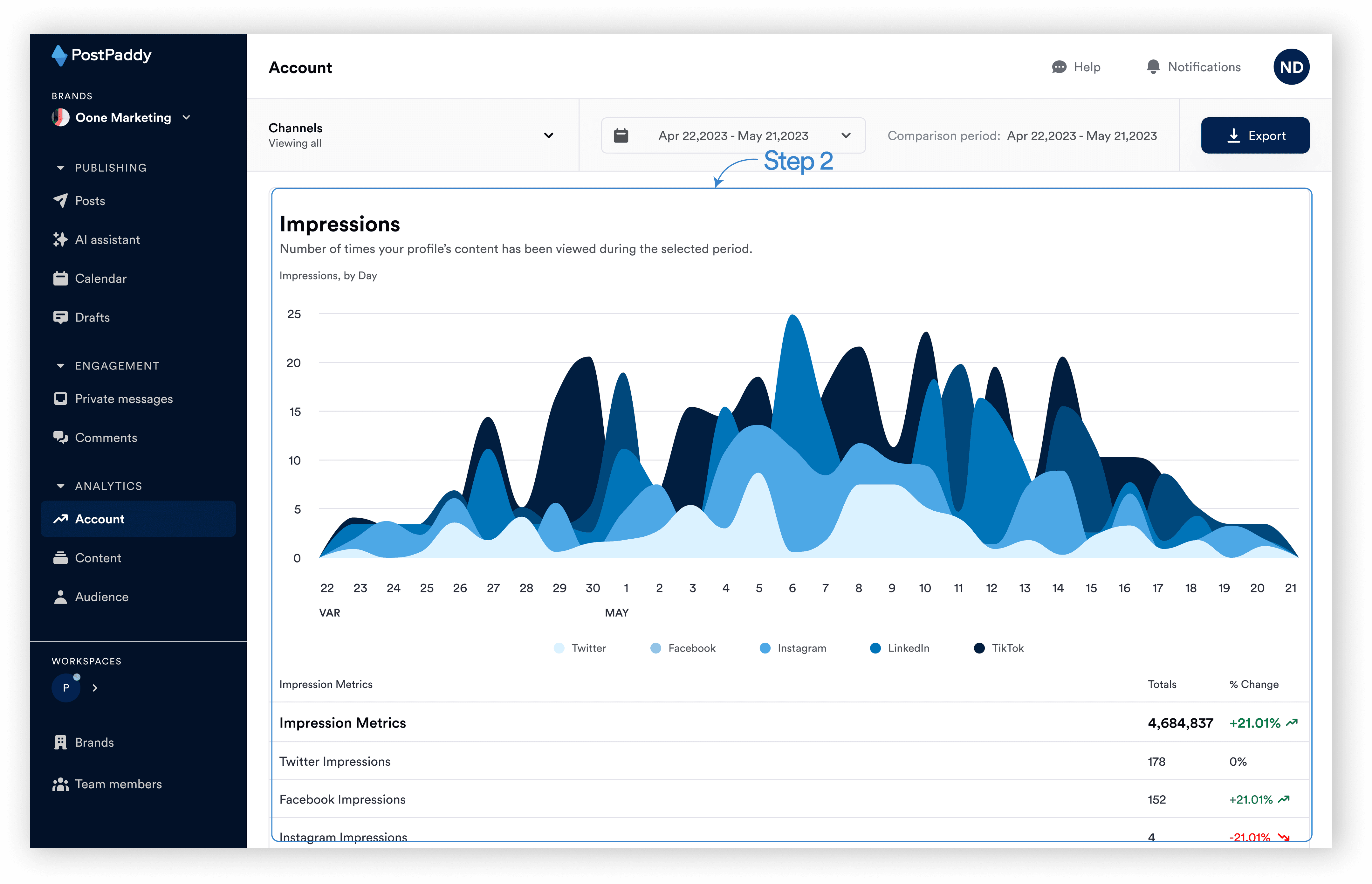 You should see a chart for impressions based on the selected channel. You can also hover over each area on the chart to see the specific impressions for that time.
