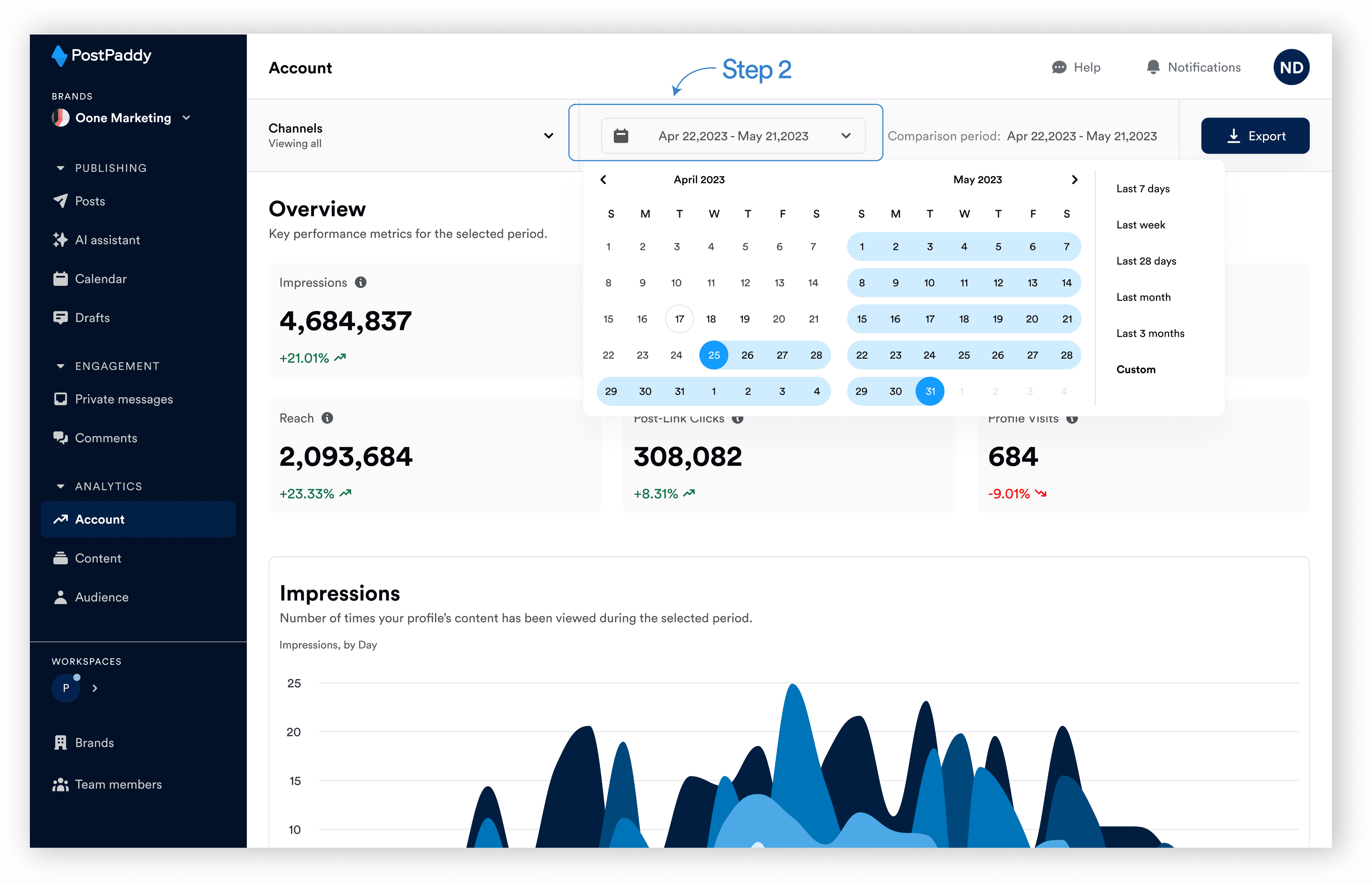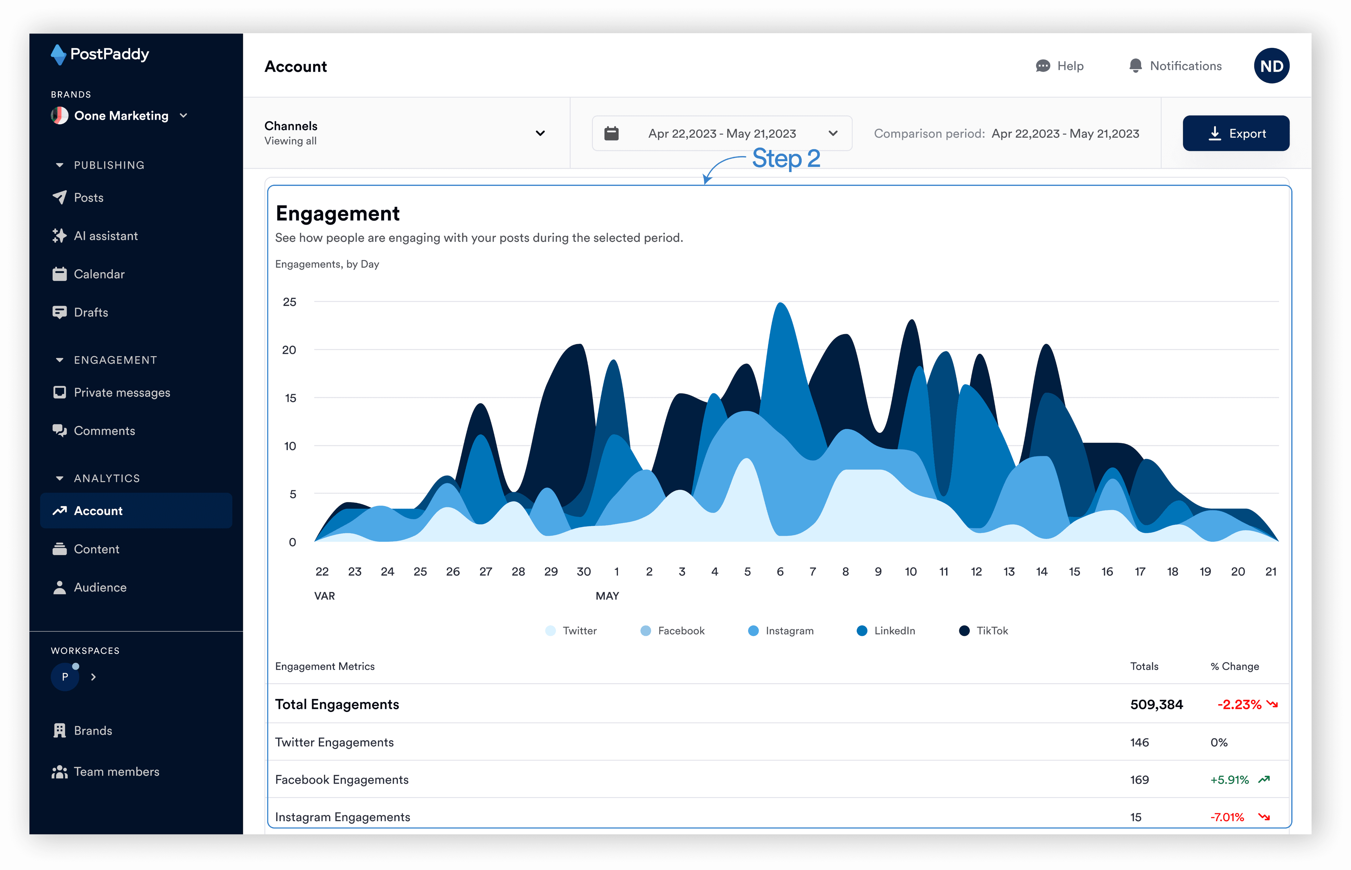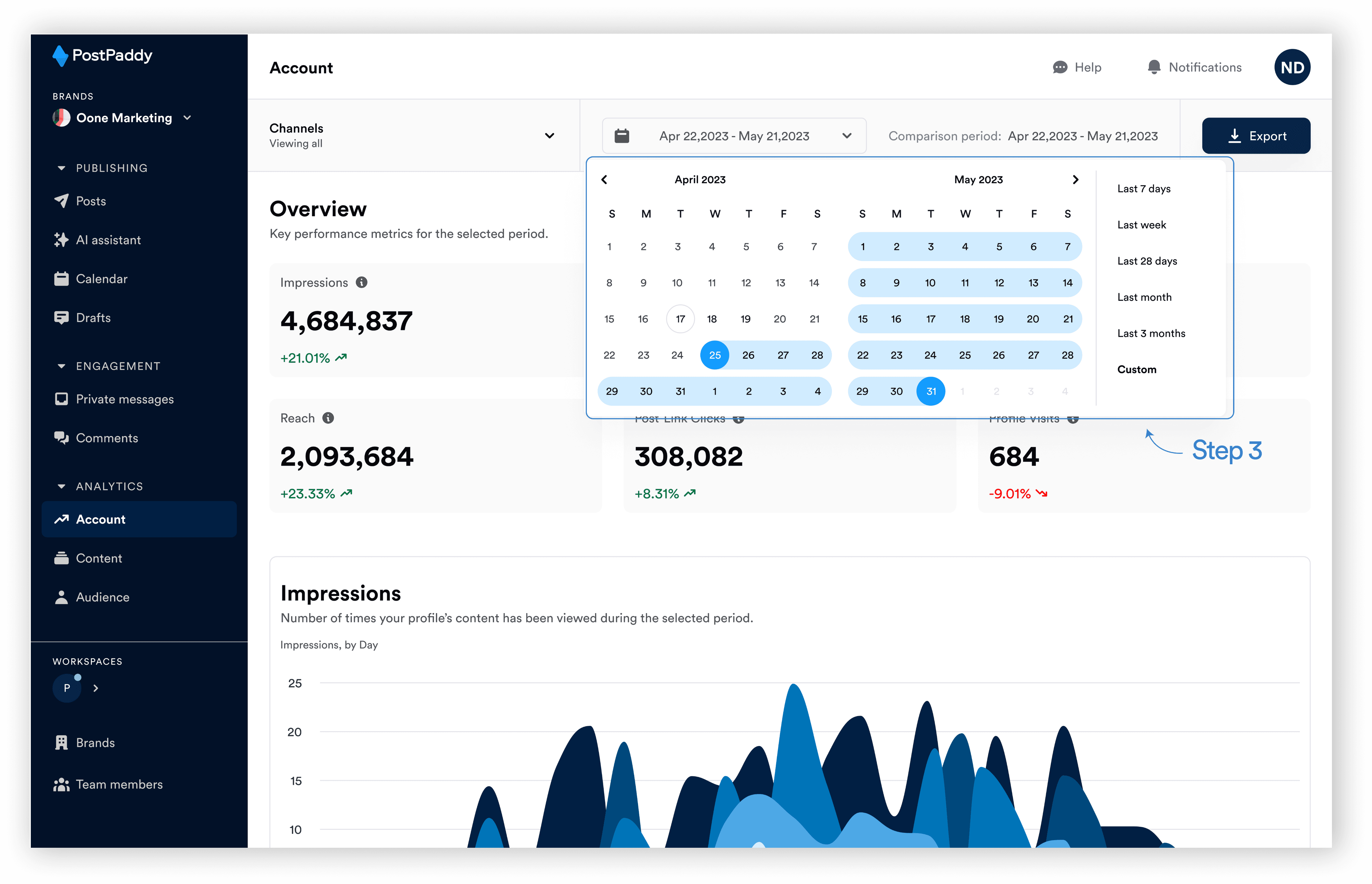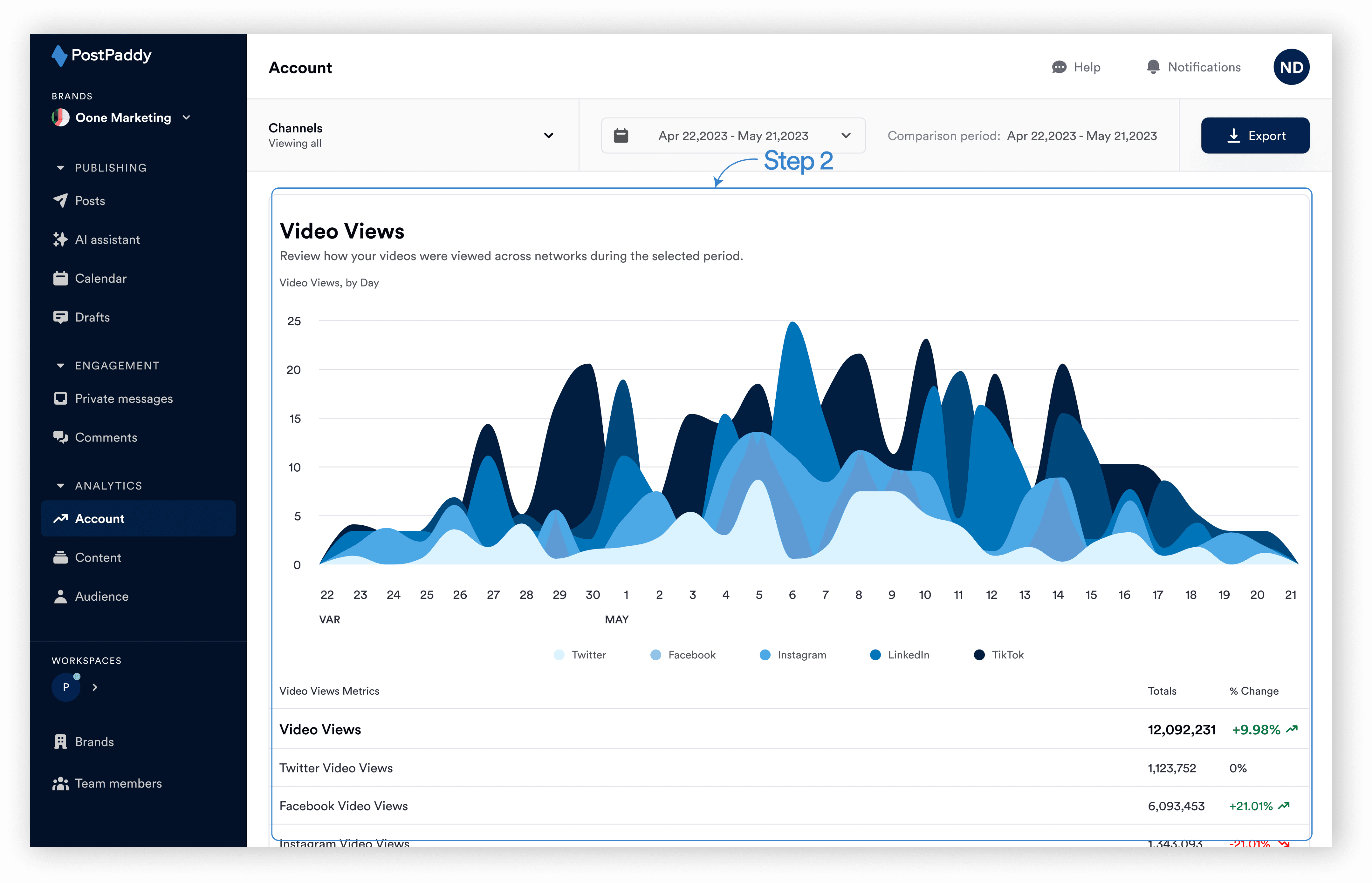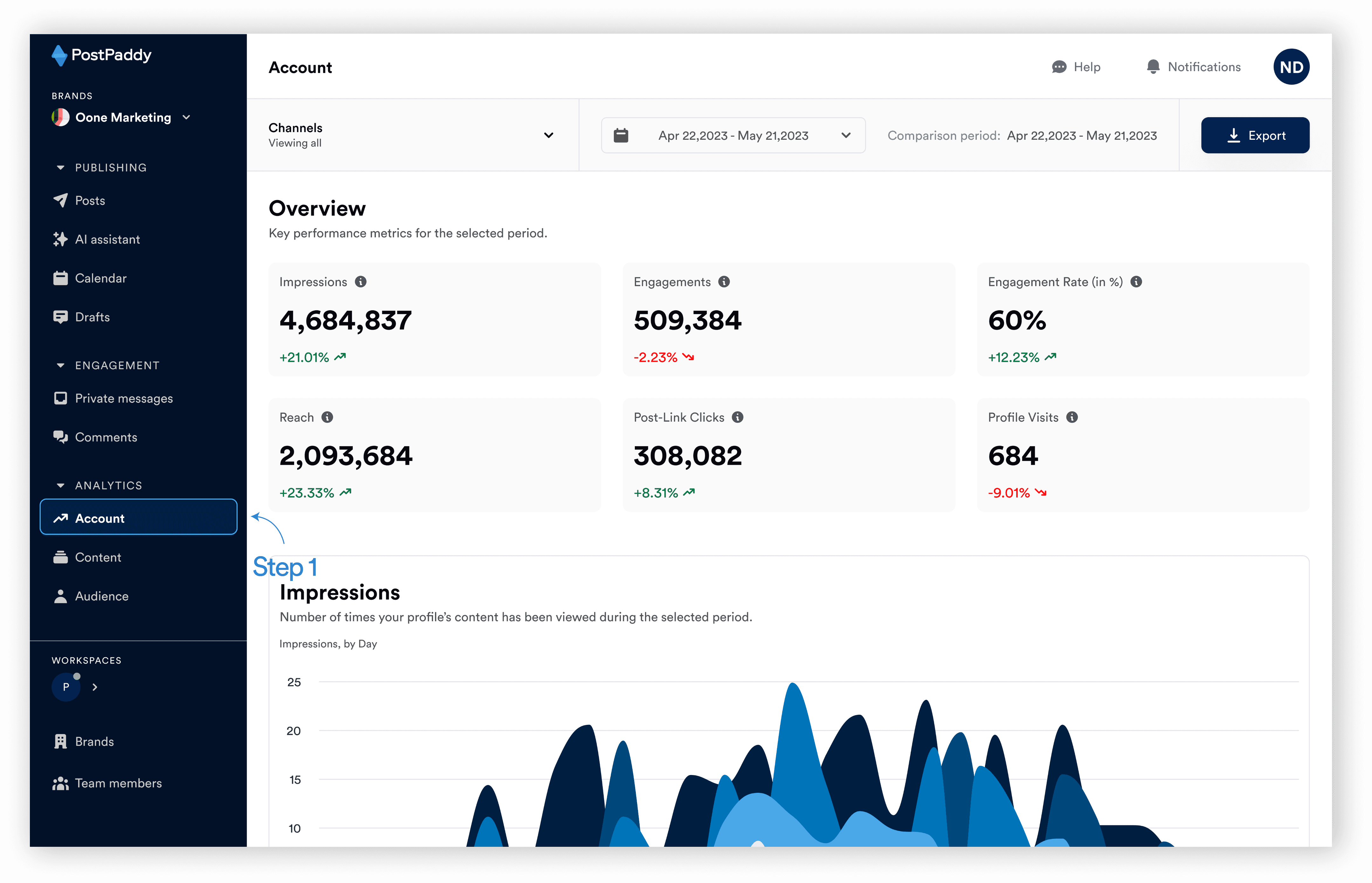 Step 1: On your PostPaddy dashboard, select "Account" on the analytics area of the side navigation bar.