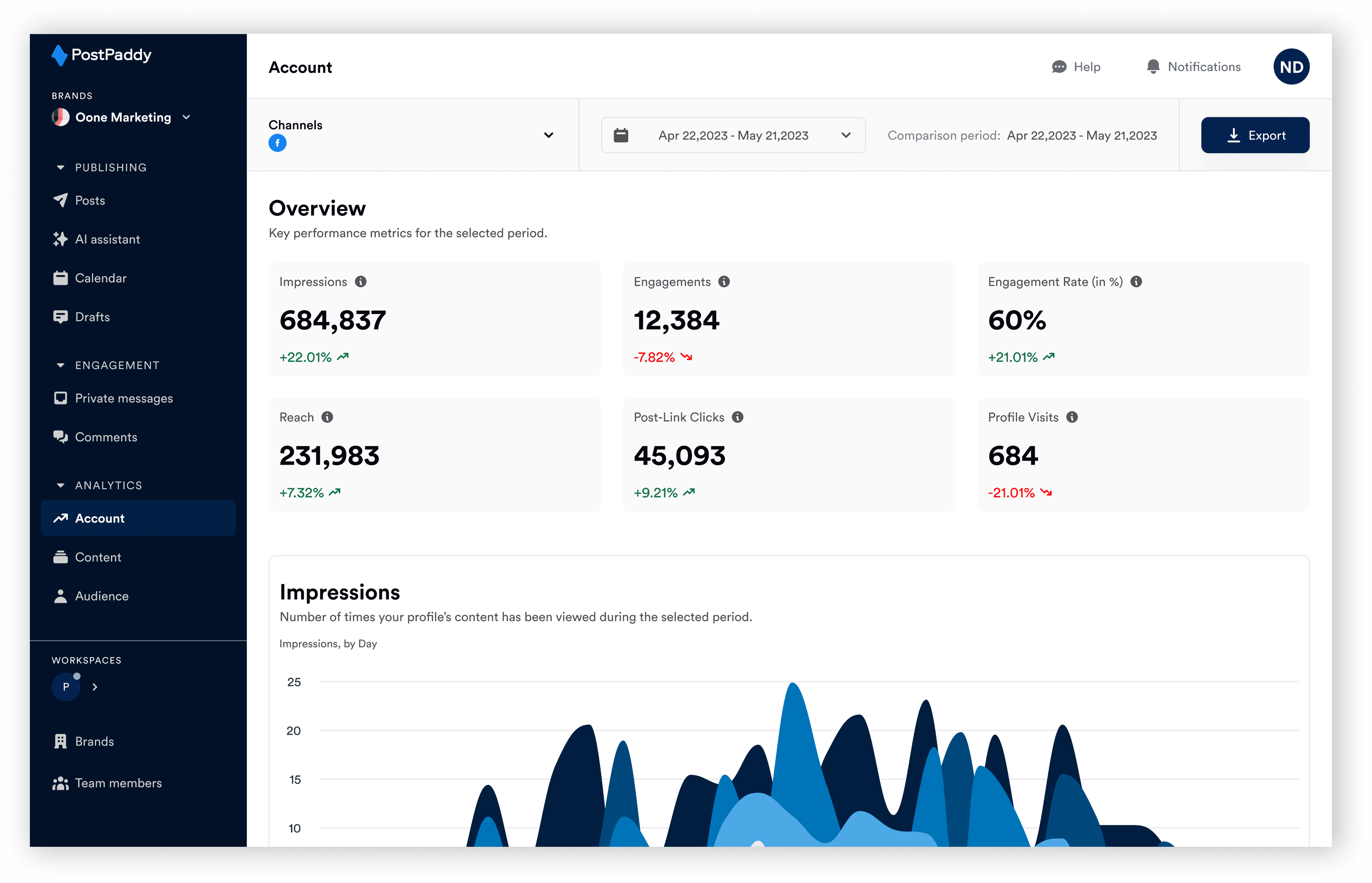 You should see overview data for impressions, engagement, engagement rate, reach, post-link clicks, and profile visits. You can also hover above each item to learn more about the data.