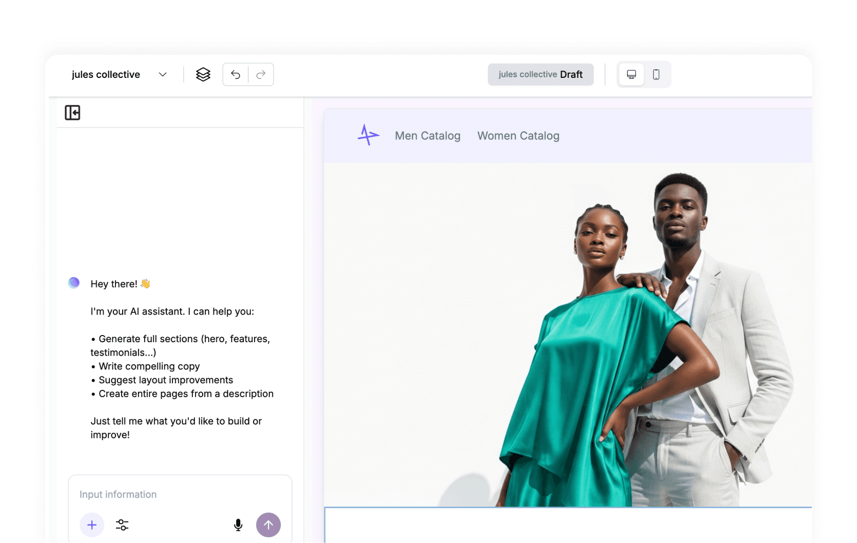 Store your brand information and images. The AI uses them to build pages that match your identity.